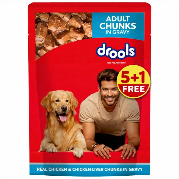 DROOLS ADULT REAL CHICKEN AND CHICKEN LIVER CHUNKS IN GRAVY 150GM *5 + 1 POUCH FREE