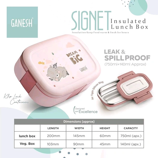 Ganesh Signet Insulated Lunch Box Leack & Spill Proof Capacity 750ml+150ml
