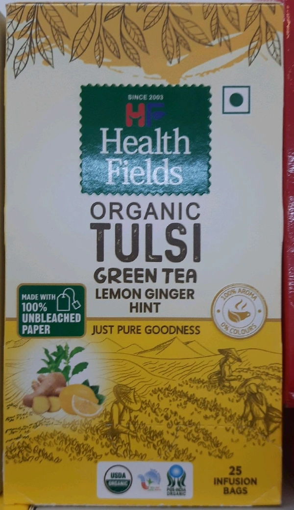 Health Fields Organic Tulsi Green Tea Lemon Ginger Hint 25 Tea Bags