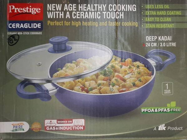 Prestige ceraglide ceramic coating non-stick aluminium deep kadhai 3.0 litre with glass lid